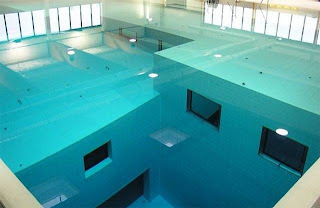 The pool itself consists of a submerged structure with flat platforms at various depth levels. The pool has two large flat-bottomed areas at depth levels of 5 m and 10 m , and a large circular pit descending to a depth of 33 m . It is filled with 2,500,000 liters of non-chlorinated, highly filtered spring water maintained at 30 °C and contains several simulated underwater caves at the 10 m depth level. There are numerous underwater windows that allow outside visitors to look into the pools at various depths. The complex was designed by Belgian diving expert John Beernaerts as a multi-purpose diving instruction, recreational, and film production facility, and opened in 2004.